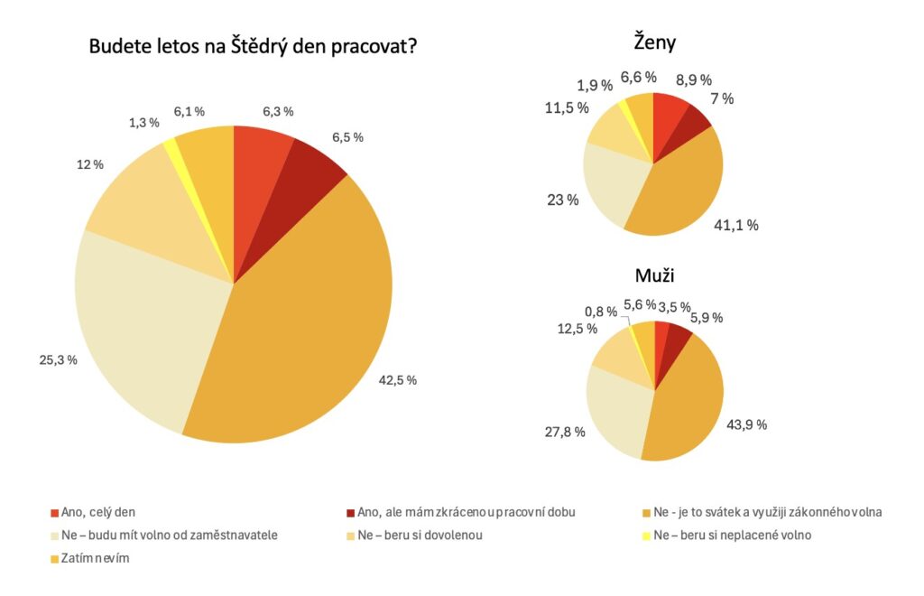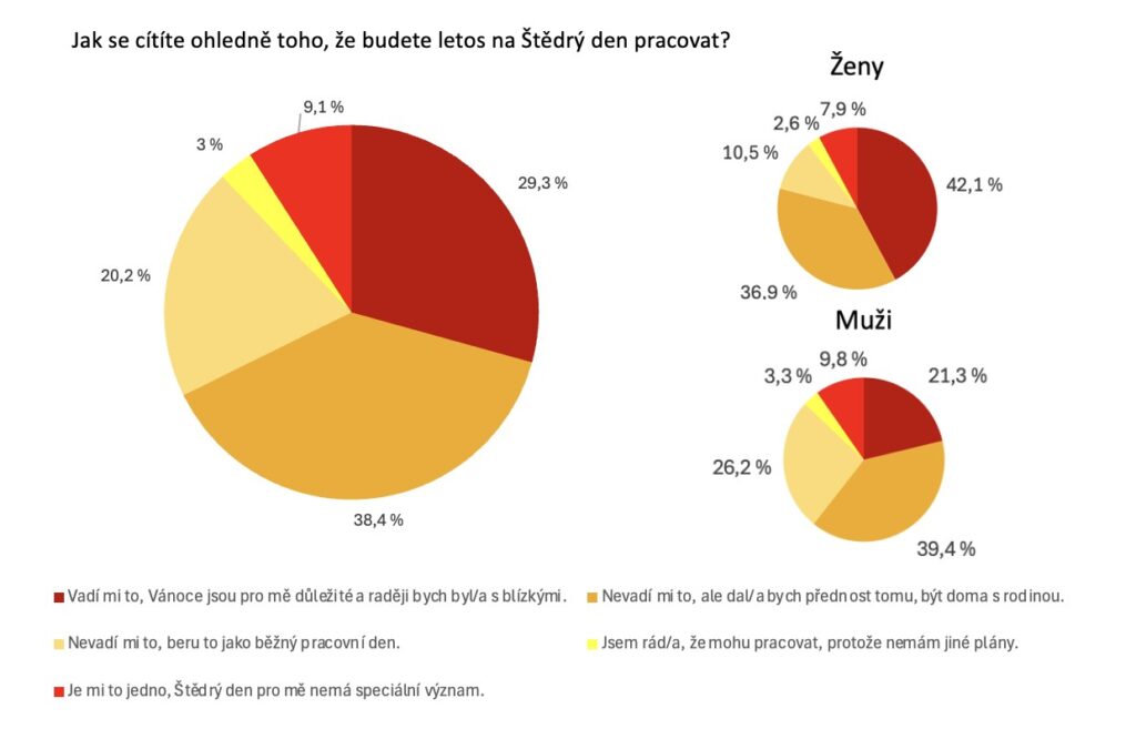 Zaměstnanci, kteří na Štědrý den obléknou pracovní oděv, se dělí do tří odlišných táborů. Zatímco 29 % bere Vánoce jako běžný den a práce je nijak netrápí, stejnému procentu pracovní povinnost vyloženě vadí. Největší skupina respondentů (38 %) je pak s prací smířená, nicméně raději by dala přednost času strávenému s rodinou.